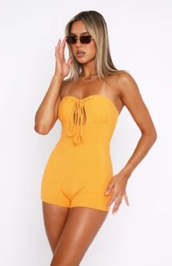 Blossom in the Hey Jude Playsuit Cream Petunia. Featuring ruched bust cups and underwire, front tie-up design, thin adjustable tie-up straps, bonding in bodice, centre back hidden zipper with hook & eye and semi sheer, lined fabric. Pair with gold accessories and platform flats for a sweet and gorgeous look!