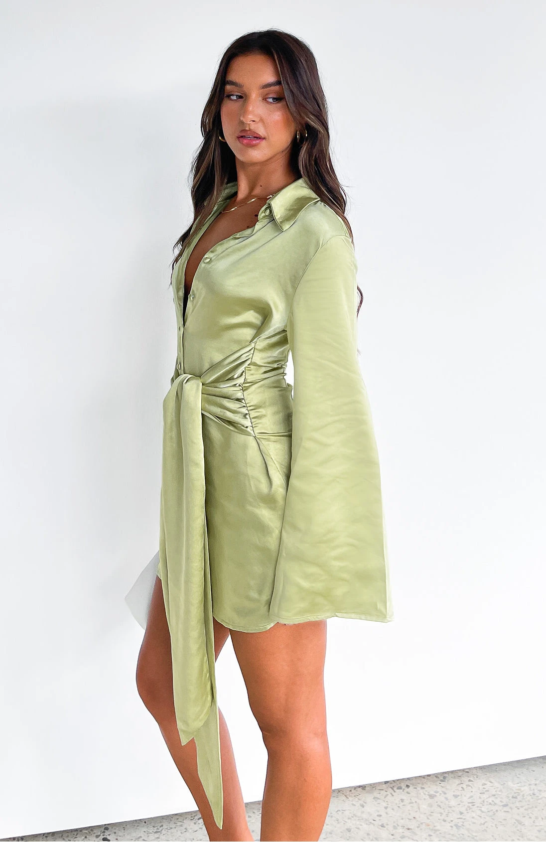 The Night Out Long Sleeve Mini Dress in Matcha speaks for itself. Featuring collared neckline, long sleeves, button-up front closure, front-tie design and lined, silk-feel fabric. Pair with gold accessories and perspex heels and get ready to be best dressed at your next event!