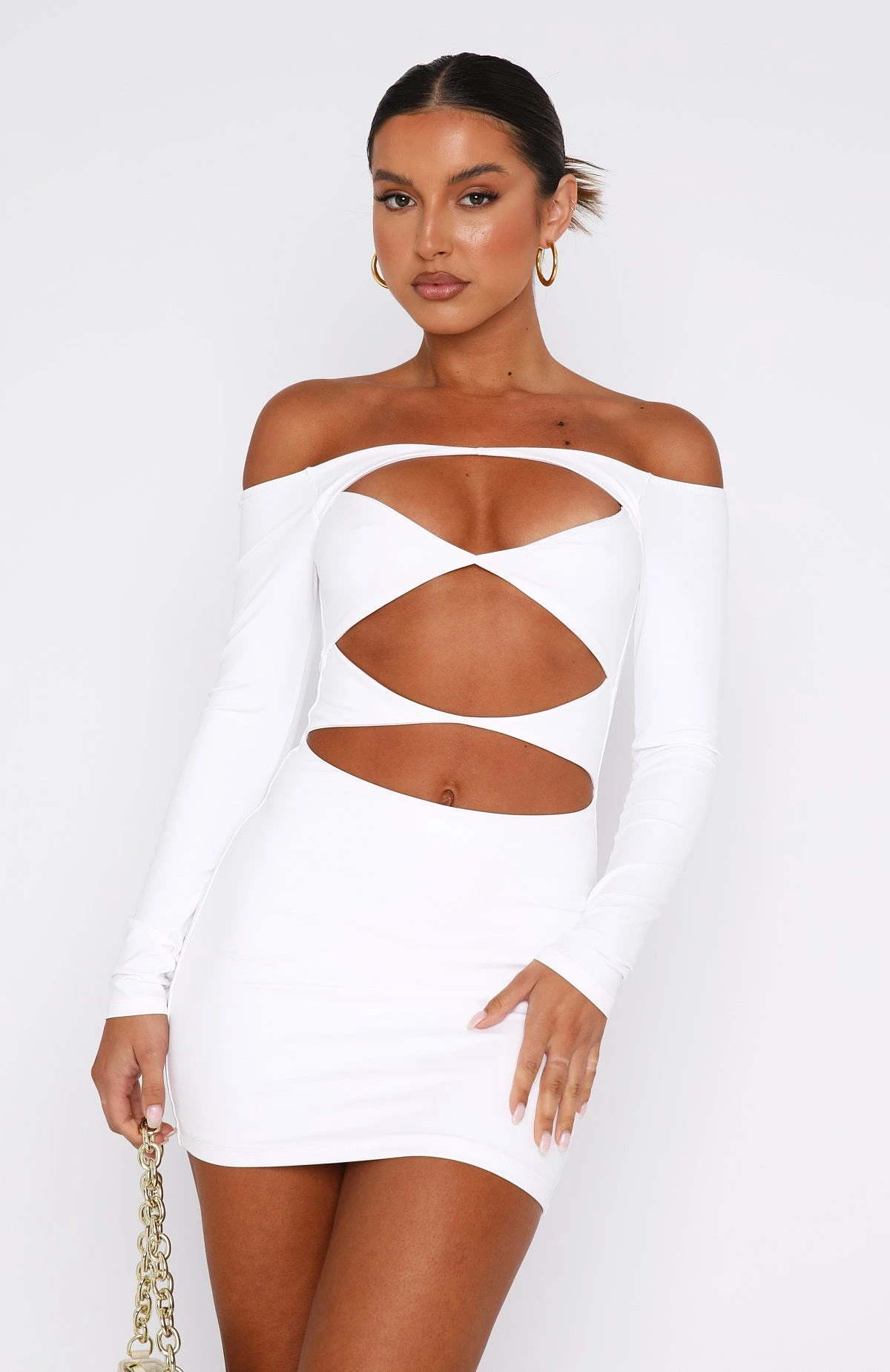 The With You Long Sleeve Mini Dress in White deserves a night out. Featuring off-the-shoulder design, long sleeves, cut-out front design and stretch fabric. We love this paired with simple accessories and clear mules and get ready for all eyes to be on you!